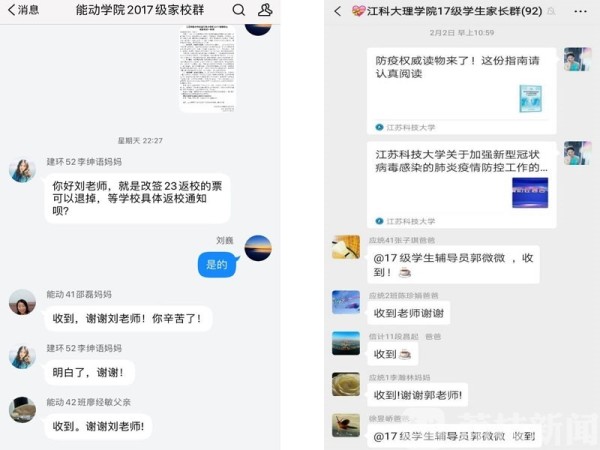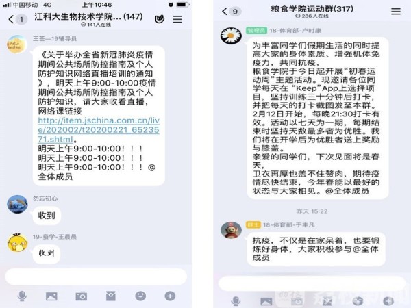 各学院辅导员通过家长QQ群、给家长一封信等方式,及时发布上级部门精神、学校公告、权威疫情防控指南等;点对点了解重点疫区学子及其家庭成员的身体状况、居家隔离状况,将学校的关心和牵挂及时传递给他们,并给他们邮寄防疫物资。同时,积极发动家长力量,提升疫情期间学生管理工作监督力,与家长共同加强学生的自我防护、学业规划、身体健康等方面的关心,通过家校联合,让学生真正做到停课不停学、提优补差。粮食学院辅导员建立学院运动群,开展“初春运动周”主题活动,号召广大同学加强居家锻炼,每天坚持训练三十分钟,并进行打卡分享。