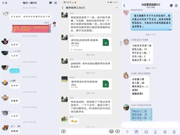 对2万余名学生的叮嘱、对重点疫区学子的关注,成为近期广大辅导员的工作日常。为准确掌握学生的健康状况,做到情况明、数据准,广大辅导员充分发挥组织优势,利用各类网络平台,分类管理、全面摸排,充分发挥寝室长、班长、学生党员等学生骨干和团学组织作用,建立宿舍、班级、专业、年级等多级网格化统计汇报制度,建好湖北籍学子、走读学子、延长学制学子等疫情防控重点学生档案,每天细心做好每一位学生防控信息排查、统计和上报工作,督促广大学生完成日常健康打卡,严格落实“日报告”和“零报告”,跟踪每一位学生健康状况。