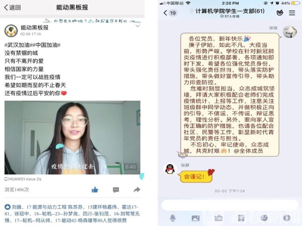 广大辅导员充分利用学习强国、微信视频、钉钉等网络平台定期组织召开网络视频主题班会。网络视频主题班会不仅传达上级部门和学校关于疫情防控的部署、居家隔离注意事项等,更细致地看到每位同学居家隔离和心理状况。各位老师充分发挥班级、团支部、党支部、义工站等学生组织的作用,组织各种“我向母校报平安”、“武汉加油!”等主题活动,进一步提升班级同学共同抗疫的信心,并动员广大学生在保护好自己的基础上,积极参与所在社区或村镇的各类防疫志愿服务活动。
