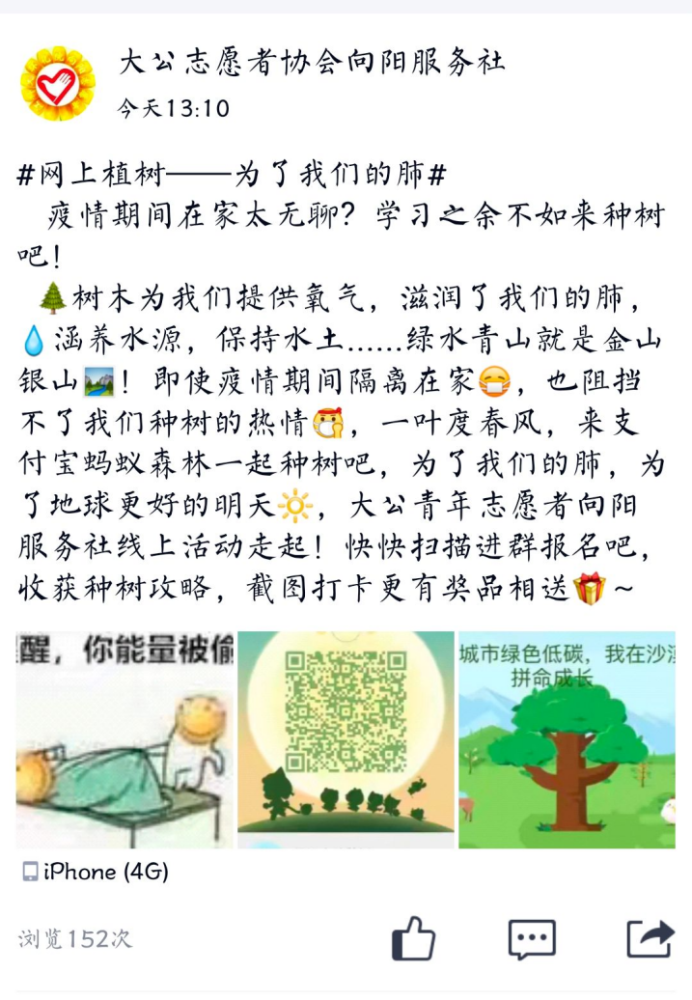 环境与化学工程学院开展“为了我们的肺”活动,利用支付宝蚂蚁森林等方式进行网上植树,一起合种树木,践行环保理念。深蓝学院开展“植树迎春色”活动,了解“植树节的来历”、“植树与环保”的同时增强环保意识,同时号召学生在“蚂蚁森林”中尽自己的一份力,进行云植树。乐竞在线平台(中国)官网(张家港)、苏州理工学院在线上展开“最美绿植评选”活动,将自己家里的绿植拍照上传,获奖同学将获得包邮到家的盆栽。