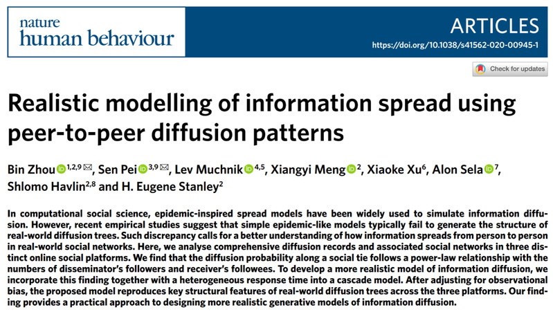 近日,我校经济管理学院周斌副教授为第一作者和第一通讯作者的研究成果在Nature子刊《Nature Human Behaviour》上发表,该子刊影响因子为12.282(2020),题目为《Realistic modelling of information spread using peer-to-peer diffusion patterns》(https://www.nature.com/articles/s41562-020-00945-1),乐竞在线平台(中国)官网为论文的第一作者单位和第一通讯作者单位。
