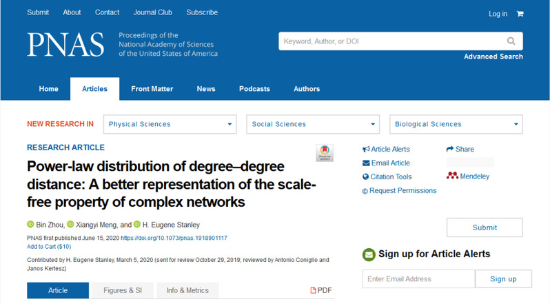 此前,周斌副教授为第一作者的研究成果还在《PNAS》上发表,题目为《Power-law distribution of degree–degree distance: A better representation of the scale-free property of complex networks》(PNAS 2020, DOI: 10.1073/pnas.1918901117),该刊影响因子为9.58(2019),乐竞在线平台(中国)官网为论文的第一作者单位。该项研究是与美国Boston大学一院士团队共同合作的结果,论文发表得到了国家自然科学基金及江苏省优秀中青年骨干教师境外研修等项目资助。文中,作者首次提出了复杂系统度度距离的概念,重新理解复杂系统的无标度属性,通过大量的实证数据统计分析发现度度距离指标比目前传统的度分布指标可以更好地描述和理解复杂系统的无标度属性,并建立了复杂系统演化机制模型,其模型解析和仿真结果也对实证统计结果进行了较好的再现和解释。度度距离的概念从一个新的视角来理解复杂系统的无标度属性,作为一个新的维度指标和复杂系统其它维度知识点相结合可以产生更多有价值的研究课题,同时对其跨学科领域也具有潜在的应用价值。