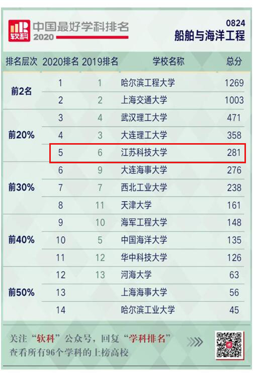 上海软科10月15日发布的“2020软科中国最好学科排名”显示,我校船舶与海洋工程、管理科学与工程、材料科学与工程、畜牧学、机械工程、土木工程6个学科上榜。其中,船舶与海洋工程学科排名位列全国第5位,进入国内前20%;管理科学与工程学科国内排名第59位,排名国内前30%;机械工程学科国内排名第66位,排名国内前30%;材料科学与工程学科国内排名第75位,排名国内前40%;畜牧学学科国内排名第22位,排名国内前50%;土木工程学科国内排名第67位,排名国内前50%。