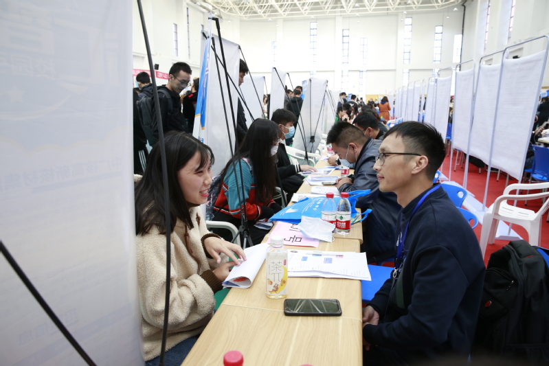 招聘会现场,招商局重工集团、南通中远川崎、猿辅导、海信电器、海隆软件等企业展位前面试咨询的毕业生很多。
