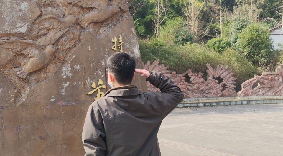 图为实践团成员在黄继光故居,向黄继光的半身像敬礼