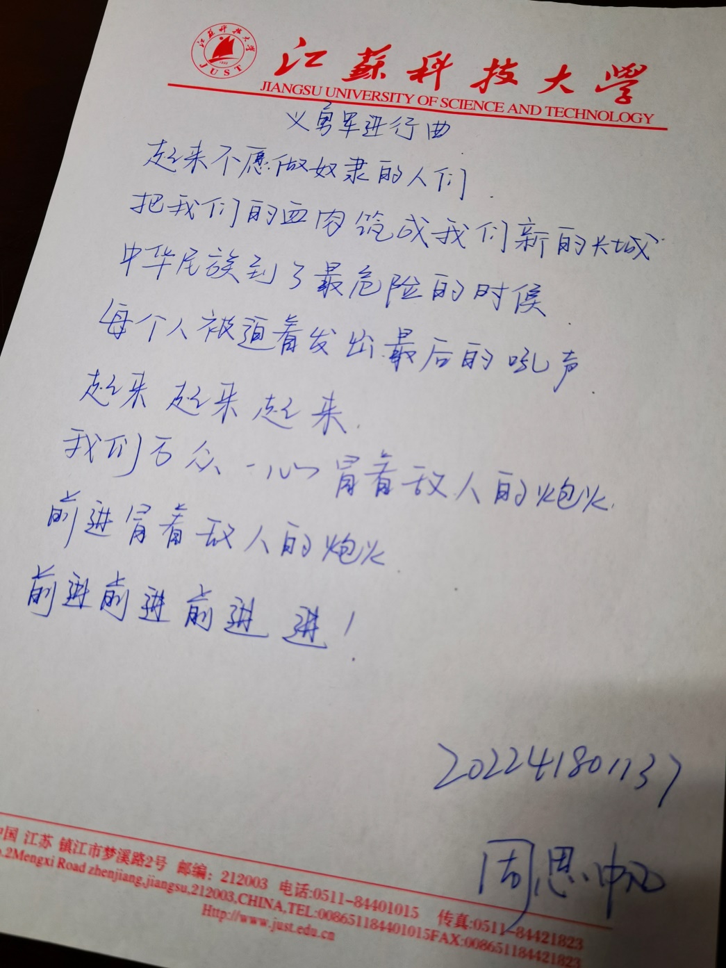更多的同学对于默写自信满满,表示在默写过程中感受到庄严和激动。农生类李清清同学说,虽然从小唱着国歌,但是第一次在这么严肃安静的环境下,一笔一划地写下国歌歌词,有一种奇妙的感受。这样的正式,让我对祖国的热爱更深了一层。