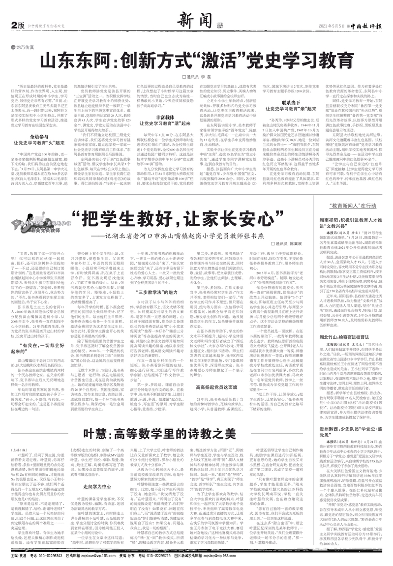 5月5日,《中国教师报》在头版“封面人物”栏目刊发专题报道,以《叶慧:高等数学里的诗教之美》为题,推介我校叶慧教授结合自身教学经验与实践积累,结合当代大学生学习特点,积极策划、灵活安排,开展大学数学课程思政教学,赋予数学基础课程诗与灵性的做法,同时配发评论员文章《良师有为》。