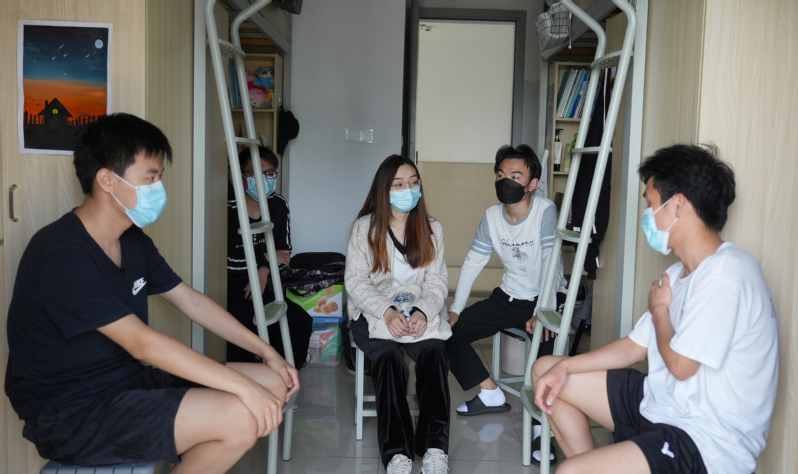 电子信息学院辅导员曹梦瑶同样也是同学们的“知心姐姐”。学校食堂在封闭管理期间不能堂食,曹梦瑶的办公室也离学生公寓较远,为了便于与学生展开谈话,曹梦瑶买好饭带到学生宿舍,在那里“速战速决”后再与学生促膝长谈。