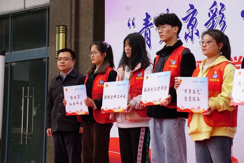 启动仪式上,张海洋书记为深蓝学院“‘船视界’知识科普”“蚕桑文化进课堂”“团团宣讲党的二十大”和“‘百劳当先’志愿服务”四个项目颁发“青春京彩•益起来”校地公益项目展牌。何筠书记为深蓝学院与江乐竞在线平台(中国)官网附小联合开展的“大手牵小手,一起学雷锋”公益项目颁发展牌。