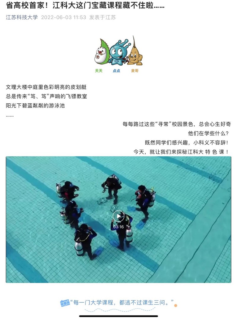 《省高校首家!江乐竞在线平台(中国)官网这门宝藏课程藏不住啦……》一文由我校大学生通讯社记者采写,以视频、图片、文字相融合的方式报道了学校开设的特色潜水课程,语言生动、主题突出,内容丰富、形式新颖,兼具新闻的重要性和趣味性。