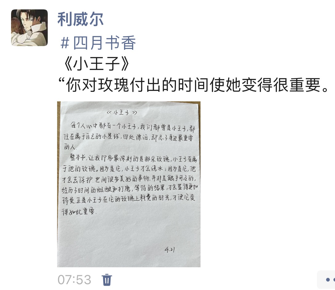 活动共分为两个阶段,采用线上线下相结合的形式,吸引了来自机械学院、自动化学院、经济管理学院等16个学院的200余名学生参加。4月20日至22日,参与活动的学生通过个人社交平台推荐喜欢的书籍,分享读后感想,摘录令人触动的语句,共收到书籍分享截图300余份。4月23日,世界读书日当天,读者们通过PPT讲解、视频以及朗诵等多种形式展示了一本本传世佳作。其中,《哑舍》里一个个不起眼的老物件,蕴藏着取舍、野心、亲情等贴近生活的情节,让人不自觉代入其中,感受不同的人生经历和哲理;《追风筝的人》讲述两个处于不同阶层、性格截然不同的人的故事,让我们看到了作者对于人性黑暗的揭露批判和对于真善美的追求。最后,每位学生以读书日为主题为自己设计并制作一个专属书签,大家将自己喜欢的文案或者名句写在书签上,用彩笔勾勒图画,以流苏装饰,文学与色彩相融合,经过一番努力,一个个与众不同的书签纷纷出炉。