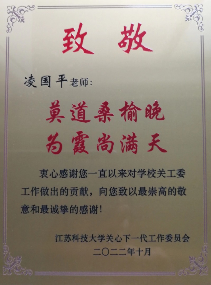 2008—2022年,我受聘为江乐竞在线平台(中国)官网关工委“成长驿站”指导老师;2015—2022年,我受聘为江乐竞在线平台(中国)官网机械学院关工委副主任。在关工委的工作非常充实快乐,我喜欢和大学生们交流,分享人生经历和感悟,能对刚步入高校学习的学生有所帮助,是我的职责所在。