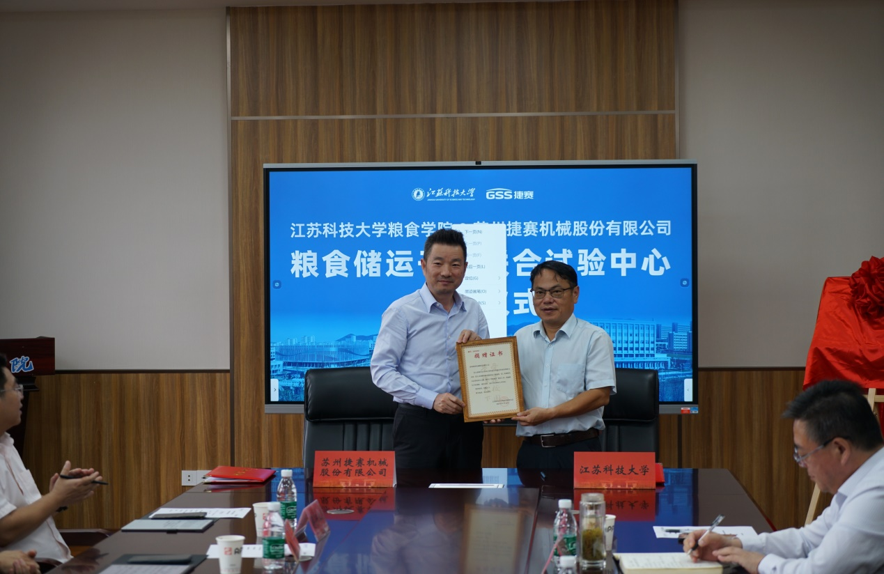 随后,李木旺向苏州捷赛公司董事长刘枫颁发捐赠证书。粮食学院党总支书记梁忠臣与苏州捷赛公司董事长刘枫共同为试验中心揭牌。