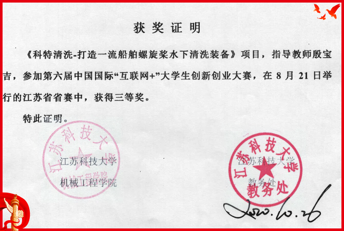 本科生取得第十二届“挑战杯”中国大学生创业计划竞赛铜奖一项;第八届江苏省大学生机械创新设计大赛一等奖1项,三等奖2项;第六届江苏省“互联网+”创新创业大赛三等奖1项;江苏省大学生数学建模大赛二等奖3项;第十三届“高教杯”全国大学生先进成图技术与产品信息建模创新大赛二等奖2项,三等奖3项等省级以上获奖40余项。研究生在第十三届国际水中机器人大赛荣获冠军2项,三等奖1项。