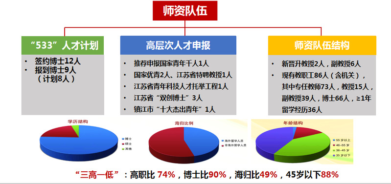 学院以“533”人才工程为契机,坚持引培并举,组建了着眼于长远发展的科研团队。签约博士13人,报到博士9人,引进江苏省特聘教授1人,已到岗并被遴选为2020年度江苏省青年科技人才托举工程资助人选;3人入选江苏省“双创博士”,新晋升教授2人,副教授6人。