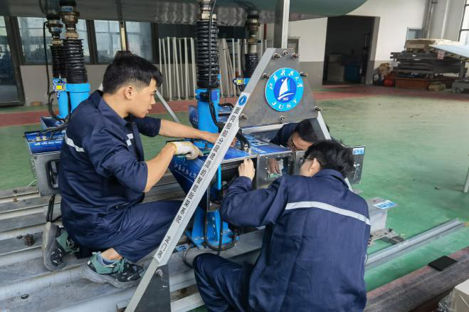 胎架是船舶分段建造过程中必不可少的工艺装备,其排列组合构成了船体分段建造的工作台。“擎天架海”团队为研发智能胎架系统,先后19次调研了国内多家船舶企业,拥有100多种船型的100多万条设计及建造工艺数据库,为胎架最优个数计算及智能化布置提供基础。最终,团队成员研制出融合智能感知和自动控制技术为一体,具有支撑点位自适应计算和布置、支撑高度智能决策、建造过程智能监控功能的国内首款智能胎架系统。