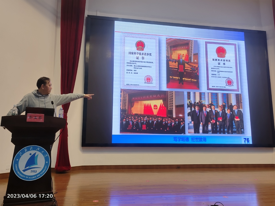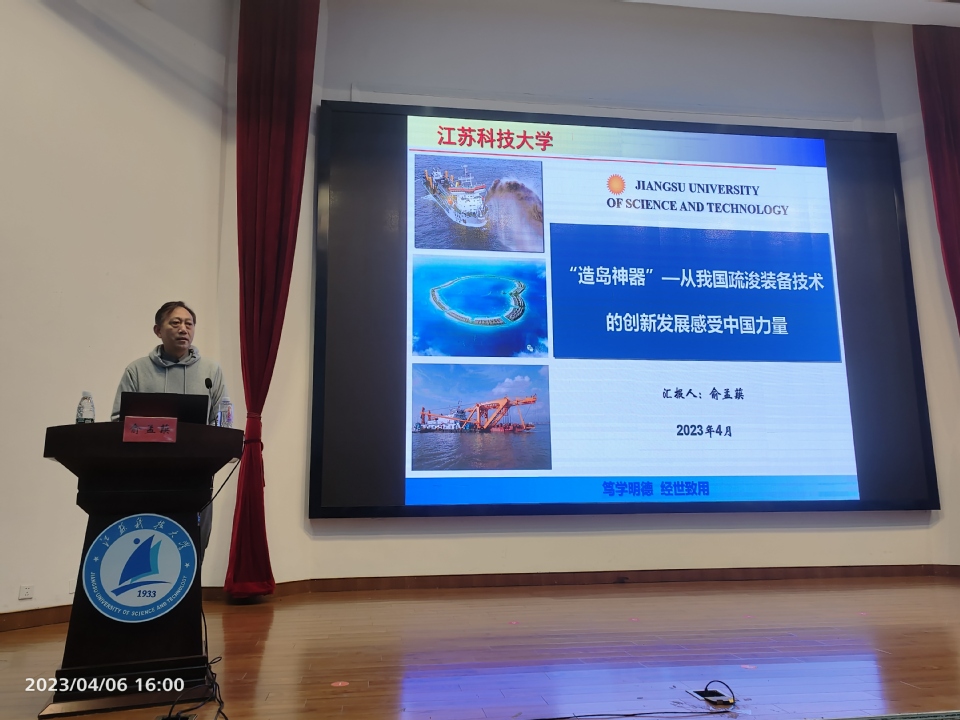 俞孟蕻教授在讲课中对我国的疏浚事业从最初的遭受国外封锁和垄断,核心技术受制于人,只能“买洋船搞疏浚”,到上世纪90年代,中国开始自主建造500方-1500方挖泥船,到2002年,中国大型挖泥船进入快速发展期,开启了大型挖泥船数字化信息化时代,再到现在,拥有世界最大的疏浚船队,耙吸船总舱容量和绞吸船总装机功率均排名世界第一这一从“引进”到“借鉴”再到“自主创新”的发展史给同学们作了详细介绍。通过对我国疏浚行业信息化、智能化的发展介绍,俞教授又从宏观层面详解了挖泥船的控制系统这一技术核心,通过实际应用中的动画和丰富的图文资料向大家展示了“造岛神器”神在哪里,带领大家领略了高科技的惊人力量。俞教授通过引用习近平总书记多次对海洋事业和海洋强国的重要论述指出,中国疏浚事业的发展和不断壮大,是一代代科研工作者埋头苦干、反复攻关、不断创新的真实写照,是中国几代船海人艰苦奋斗、努力拼搏谱写出的辉煌篇章。以俞教授为代表的江乐竞在线平台(中国)官网人在其中做出了努力、贡献了智慧,体现出江乐竞在线平台(中国)官网人在船舶海工领域“吃得了苦、扎得下根、聚得齐心、干得成事”的特质。