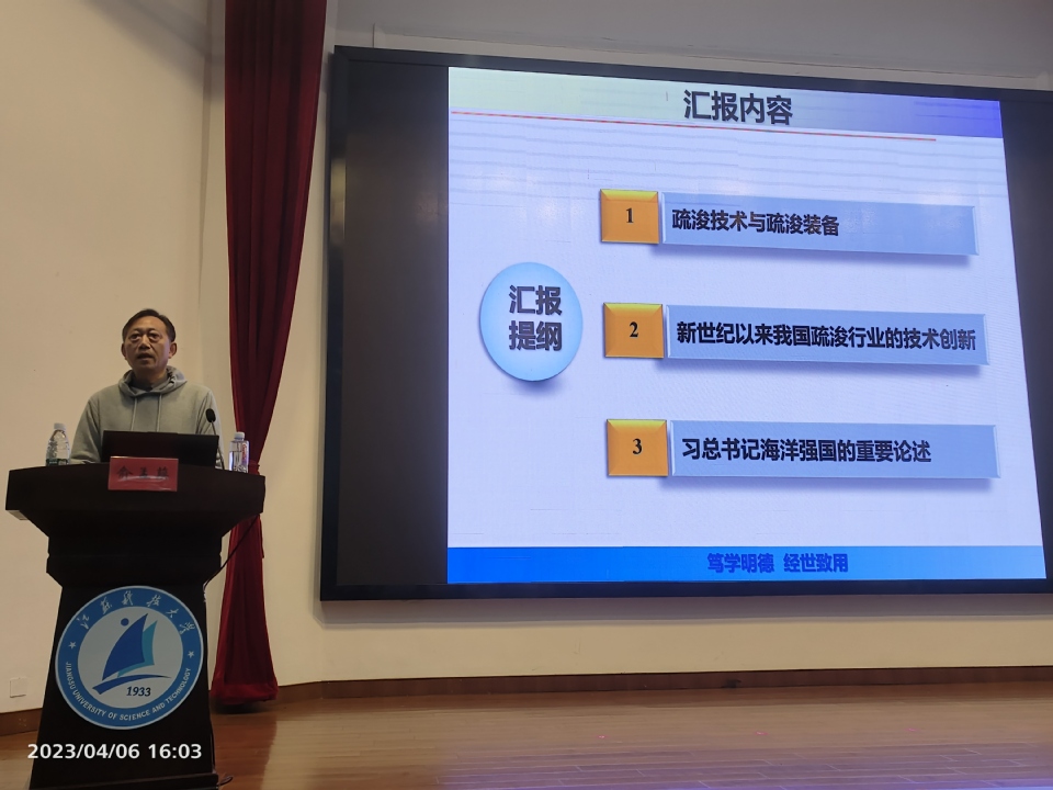 俞孟蕻教授开始以乐竞在线平台(中国)官网近年来在船舶海工领域所取得的标志性成果为引,从“疏浚技术与疏浚装备”“新世纪以来我国疏浚行业的技术创新”和“习近平总书记海洋强国的重要论述”三个方面,详细讲解了我国疏浚技术的发展历程,技术创新步伐和实际应用场景。俞教授以实际事例告诉广大同学,“一个民族的强大与发展,将取决于这个民族的海洋文化的建设,海洋意识观念的强弱。”