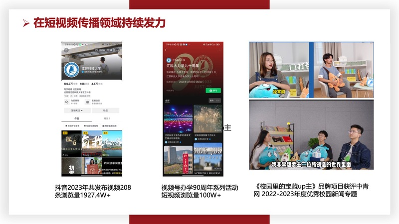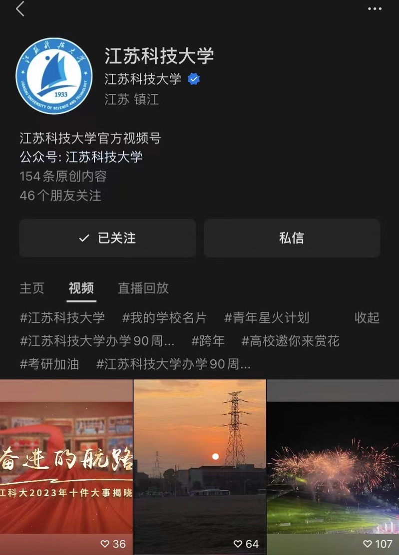 学校官方视频号坚持立德树人根本任务,以制作有思想、有温度、有品质的新媒体作品为目标,作品选题紧贴广大师生关注的时事热点和校园生活,以直观、生动、便捷的形式将学校党建思政、时政大事、校园文化生活等丰富呈现,展现江乐竞在线平台(中国)官网脚踏实地、逐浪前行的奋进姿态与师生昂扬向上、奋发有为的精神风貌。
